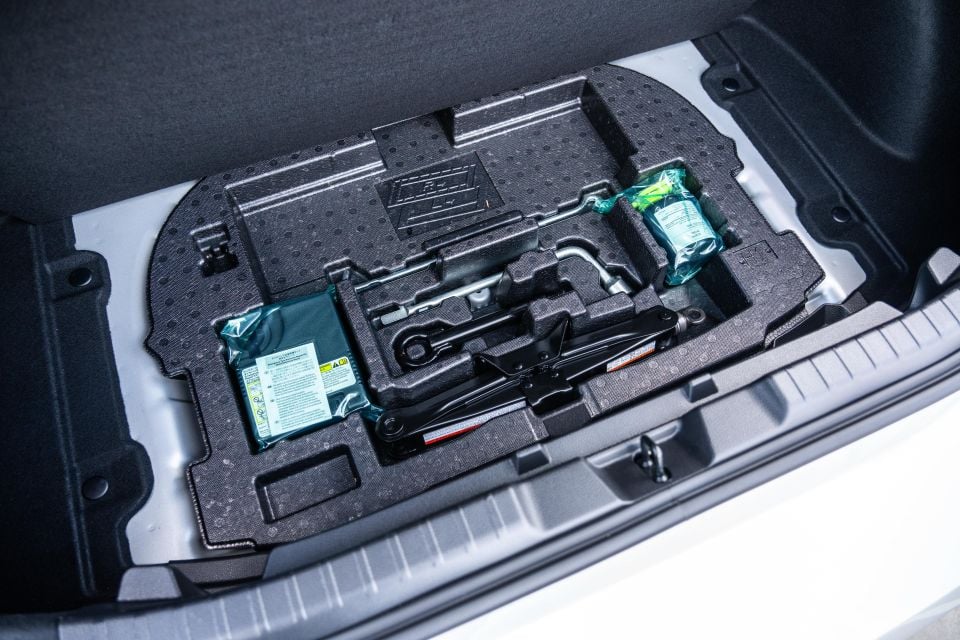 Flat tire? No spare. You get a repair kit. On the bright side, accessing the under-floor storage is still manageable. Prop the boot floor open with its clever hook-and-parcel-shelf-string contraption.